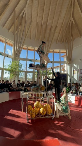 Az aulából a Fővárosi Nagycirkusz művészei pillanatokon belül igazi porondot varázsoltak a Veresegyházi Katolikus Gimnáziumban, amelyet egész napra birtokba vettek a cirkusz művészei. A hihetetlenül vidám és színes produkciót elkísérte Hankó Balázs innovációért és kultúráért felelős miniszter, Nagy-Vargha Zsófia fiatalokért felelős helyettes államtitkár és Fekete Péter, a Nemzeti Cirkuszművészeti Központ főigazgatója is.