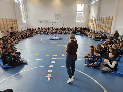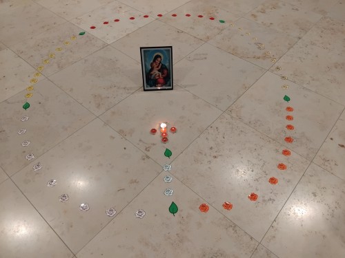 „A tornateremben gyűltünk össze és padlóképes módszerrel, előimádkozók (1-8. osztályosokig) segítségével mondtuk az örvendetes olvasót” – számolt be róla az intézmény.