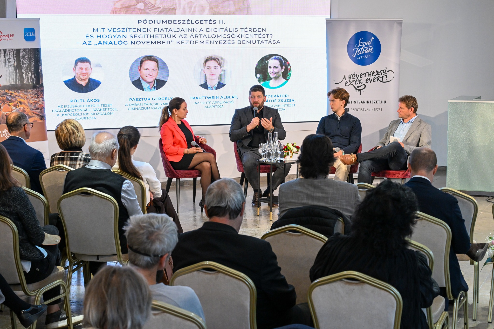 A rendezvény elején Máthé Zsuzsa, a Szent István Intézet igazgatója megfogalmazta a célt: országos összefogás szükséges a szülők, pedagógusok és diákok bevonásával, amely az online térben töltött idő tudatos visszaszorításával és pozitív alternatívák ösztönzésével védi a gyerekek testi-lelki‑szociális fejlődését.