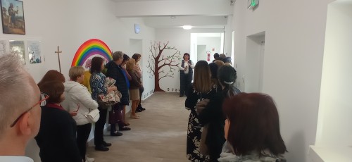 Bali Imréné Adrienn, a salgótarjáni székhelyű Jó Pásztor Katolikus Óvoda igazgatója örömmel és hálás szívvel vezetett körbe bennünket az épületen, majd az óvodások egy rövid műsorral is kedveskedtek nekünk.